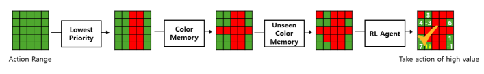 LP(Lowest Priority), CM(Color Memory), UCM(Unseen Color Memory)와 같은 다양한 휴리스틱 알고리즘을 연구하고 구현하여 액션 공간을 줄였습니다. - 앙상블 추론 방법론 적용: