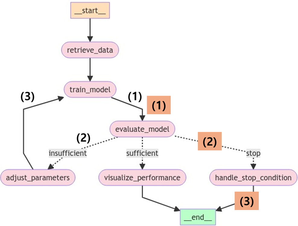 | handle_stop_condition | Stop the workflow due to reaching the maximum iterations 정해놓은 run id 에서 결과를 찾지 못하면 종료 |