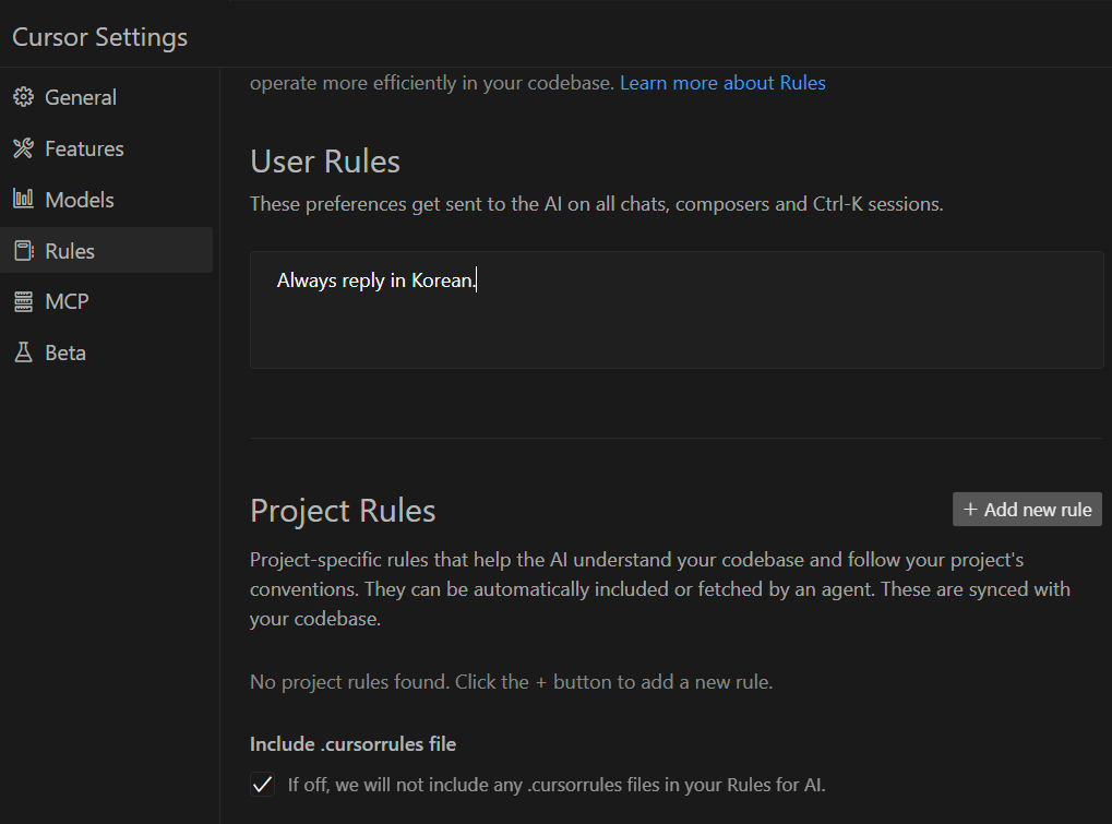 - 위치: Cursor Settings > General > Rules for AI