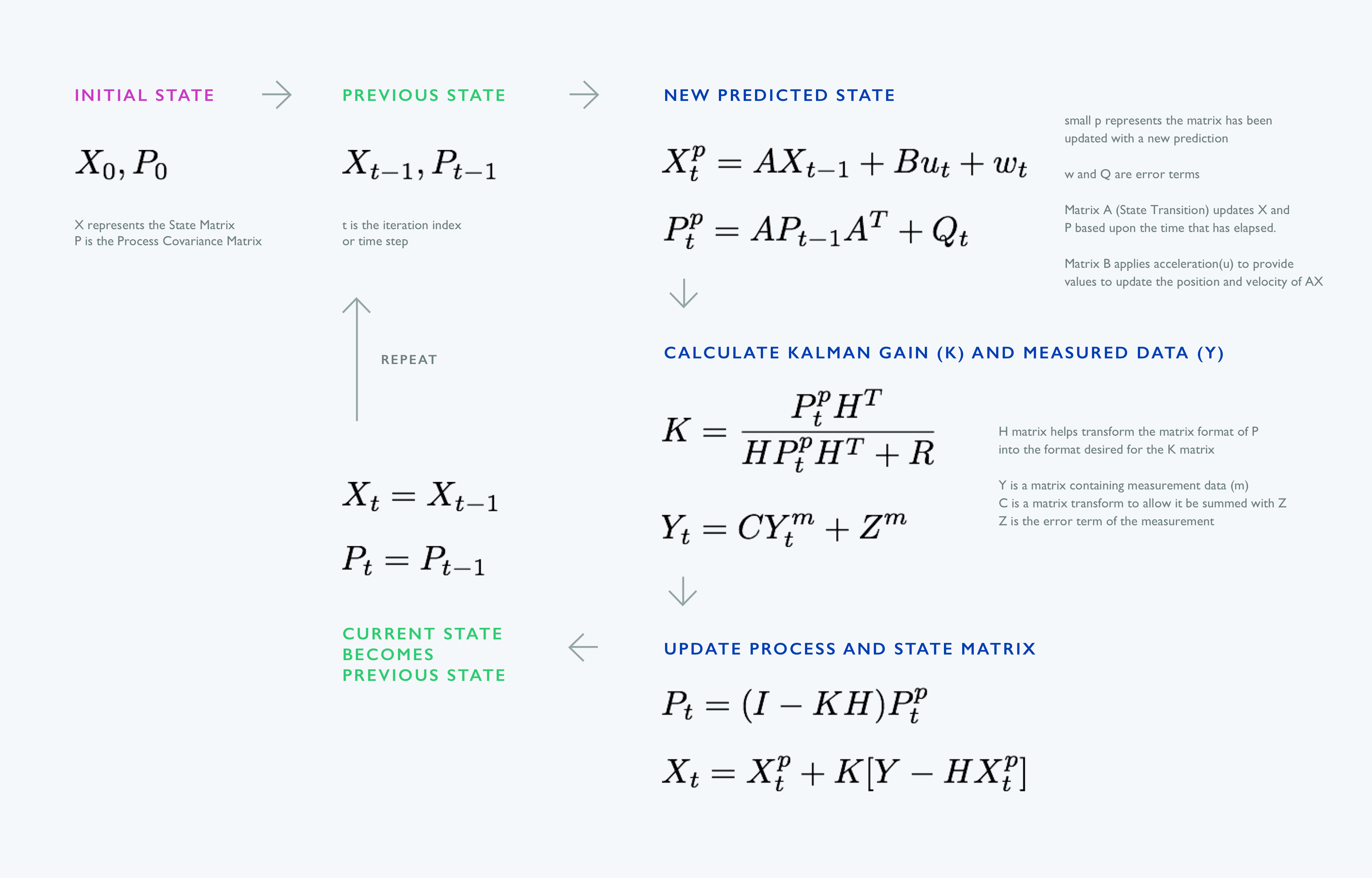 아래의 흐름도는 재귀 프로세스를 보여줍니다. 처음부터 필터는 추적 중인 측정의 현재 값(예: 위치, 속도)을 포함하는 상태 변수를 추적하는 반면 프로세스 변수에는 해당 측정의 예측 오류가 포함됩니다.