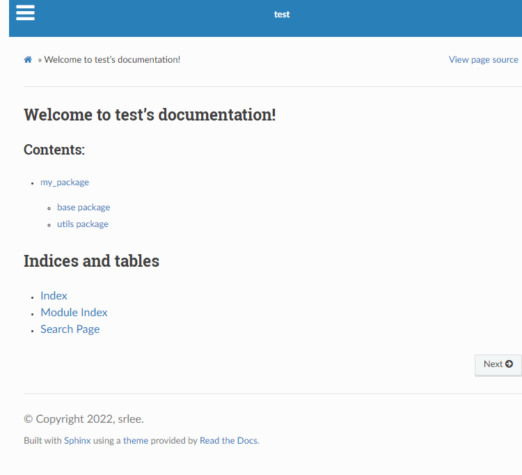 현재 conf.py 의 경로가 ./sphinx-test2/docs/source.py 에 있고, 내가 새롭게 만든 소스 코드는 ./sphinx-test2/src/my_package이기 때문에, 경로를 2번 내려가고 src/my_package로 연결한다.