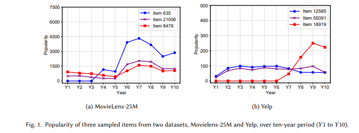 예를 들어, 그림 1의 타임라인을 따라 아이템이 다른 인기 패턴을 보여줍니다. 테스트 기간이 길면 모델이 글로벌 타임라인에 따라 이 시간적 콘텍스트 변화를 학습할 수 없습니다.