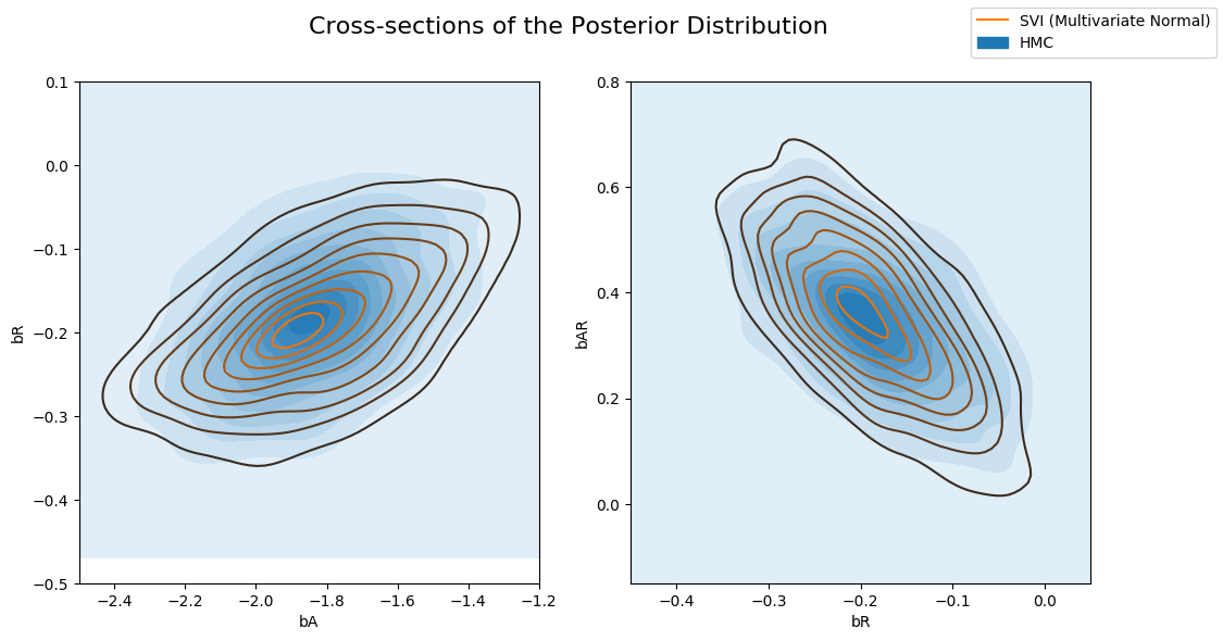 이것은 변동 추론의 대략적인 사후 분포와 중첩된 joint 사후 분포로부터 다른 단면을 그릴 때 더 잘 보일 수 있습니다.